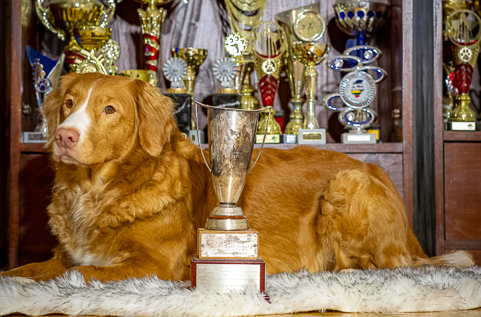 Lukuisia "vuoden koira" -voittoja eri yhdistyksiltä, arvostetuimpana kuvassakin oleva Paatsan Malja, mikä saattaa hyvinkin tulla Charmille tänä vuonna jo kolmannen kerran.